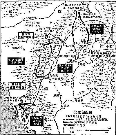 缅甸季节性战役的情况,与预料中的完全不一样,和目前同盟军在太平洋,特别是在中太平洋的急速进军相比,则是令人失望的。因为缅甸战争的主要特点是日军又发动了一次进攻,并已越过了印度边界进入阿萨姆南部——这是日军在战争中仅有的一次——而英军则一直在打算发动一次旨在把入侵者赶出缅甸北部并打开通往中国那条公路的攻势。从印度出发的交通运输线已大为改善,英军实力也日益增强,呈现出来的是一片美好的前景。