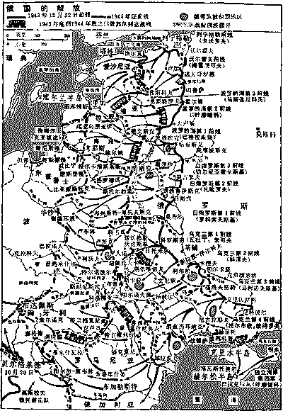 到7月中旬,红军不仅把德军赶出了白俄罗斯,而且进据波兰东北部的一半地方。红军最西边的部队已纵深插入立陶宛(Lithuania),并离东普鲁士边界不远了。在这里,他们同德国的北路集团军群侧翼驻地相隔不到二百英里,这个北路集团军群由弗里斯纳(Friessner)指挥,至今仍控制了进入波罗的海各国的正门。巴格拉米扬的先锋部队当时已逼近德文斯克,他们比起弗里斯纳的德军战线来更加靠近德军的里加(Riga)基地。切尔尼亚霍夫斯基所部业已到达维尔纳那边的涅曼河(Niemen),他们沿着一条远在西边的战线前进,几乎已接近波罗的海了。这样一来,看来在弗里斯纳所部能撤退以前,在其后方,似乎会建立起一道双重屏障。他的处境日益困难,因为俄军在普斯科夫地区北面扩大了攻势——在这里,马斯连尼科夫指挥的“波罗的海第三方面军”和叶廖缅科所部发动了联合攻势。