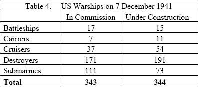 经过多年由一系列发展因素和几个关键人物的推动,合众国海军到1941年12月7日经过前8年在战舰建造上已经取得显著跨越,攻击珍珠港那天,在建战舰数量实际超过舰队当时的战舰数量,如表4。