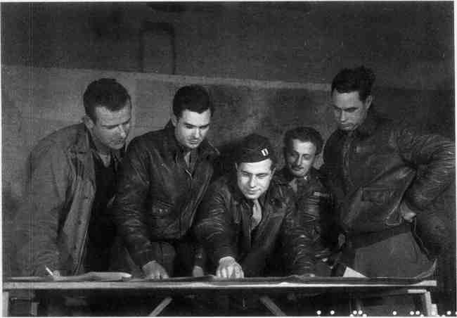 一架B-17轰炸机的驾驶员、副驾驶员、导航员、无线电员和投弹员在起飞执行任务以前审视目标地区地图。目标的最终实现需要用心协作。