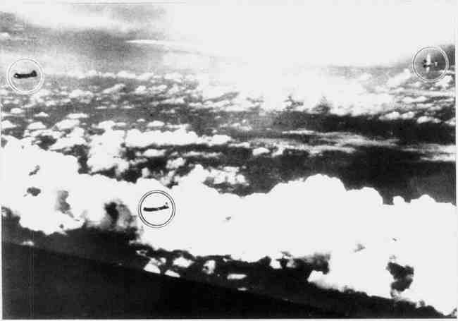 一架梅塞施米特Bf 110(图右圈内)出现,对B-17轰炸机编队(图左)猛攻。Bf 110配有火箭时形成很大威胁,然而面对护航战斗机它却显得十分脆弱。
