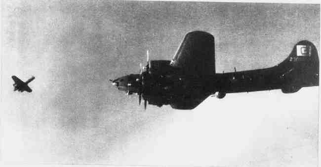 “行动已经提早开始了。机组成员感觉不妙。那两架战斗机来势迅速,不做任何准备,刚爬升就行动,似乎有些不择手段。3分钟后,各机枪手报告战斗机群从各个点钟方向爬升。有的成单,有的成双。成双的有的是两架FW190,有的是两架Me 109。我们的轰炸大队每一架B-17上的每一挺机枪都在开火,弹道在我们这一片天空交织。这次冲突中双方都各有损失。我们大队队形中下方中队里的两架轰炸机和前方大队里的一架轰炸机着火,脱离了编队,机组成员同时跳伞。对方几架战斗机着火落向地面,后边则跟着飞行员们和他们暗黄色的降落伞。我注意到在我们右方飞行的,在射程以外的一架Me 110。这架飞机一直保持与我们同步飞到目标,显然是在向接下来要攻击我们的那些中队报告我们的位置。看到所有的这些战斗机,我明显地感到落入了圈套。我们大队好像突然要大难临头了,因为战斗机群正飞过前方大队,以对我们发起攻击。