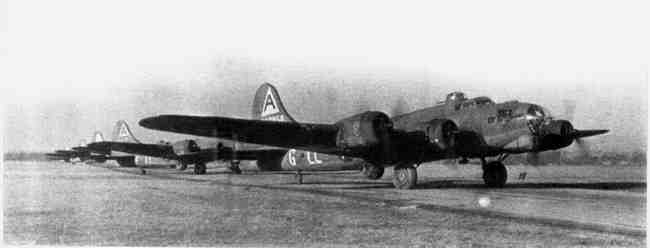 1944年底,巴辛伯恩基地第91轰炸大队的B-17G轰炸机列队准备起飞。请注意该大队从1942年6月到1945年7月采用的编号“LL”,另外机头下部炮塔也是B-17G轰炸机的特征之一。