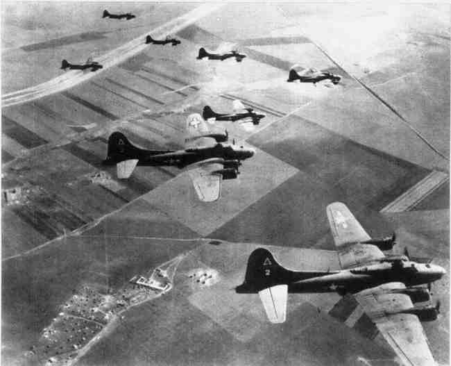B-17G轰炸机由P-51野马战斗机护航飞往柏林。远程的野马战斗机能够将轰炸机护送到目标并返回,牵制德军战斗机的力量。
