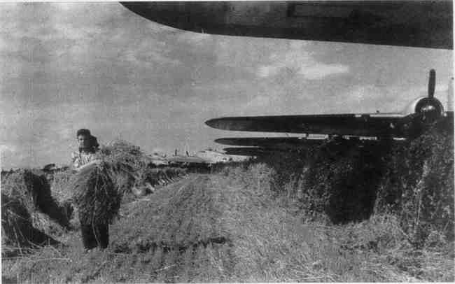 1944年夏末,一名英国陆军的工人在B-17轰炸机机翼下收获庄稼。这个场面和欧洲激战的天空形成了强烈的对比。