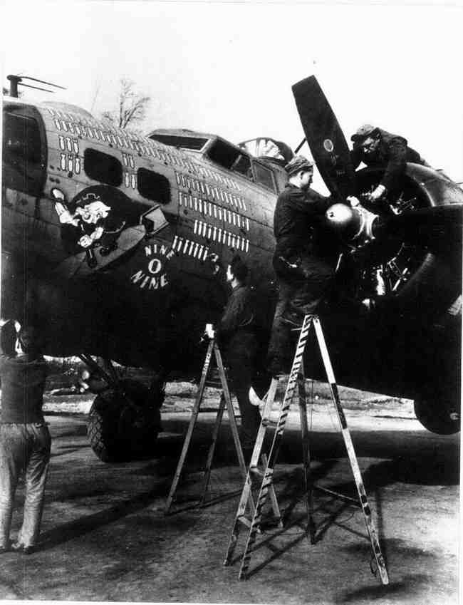 地勤人员检修飞机时,第91轰炸大队第333中队的一名人员给“909”号B-17G轰炸机漆上行动标志。这架飞机共完成了140次任务。