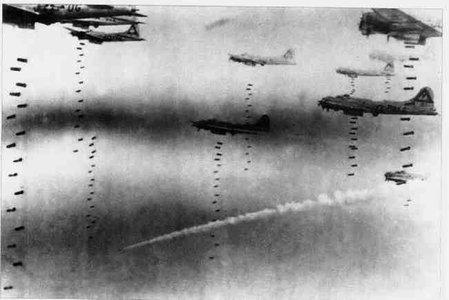 这张照片显示出1944年12月18日攻击雷根斯堡储油设备时炸弹落向目标的情景。一年前也是对雷根斯堡的袭击中第8航空队遭受了极为严重的损失。