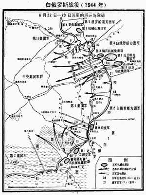 苏联的官方报道说,一九四四年七月三日第一波罗的海方面军以及第一、第二、第三白俄罗斯方面军的战略性作战行动的第一阶段以收复明斯克而结束。这样,俄军的夏季攻势获得了它的第一个目标:解放白俄罗斯。同时,它把德军防线撕了个大缺口。中央集团军群这时只有八个分散的师,却要在一条长达二百多英里的防线上对付俄军一百一十六个步兵师、六个骑兵师、十六个机械化步兵旅和四十二个装甲旅。几天以后,遵照俄军最高统帅部七月四日发出的把攻势推移过旧俄波边界的命令,俄军诸“方面军”又向前推进。在北面,它们取道莫洛杰奇诺向维尔纳推进;在南面,则经由巴拉诺维齐向布列斯特推进。