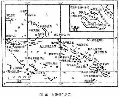 美国海军的作战计划是,使用受过两栖作战训练的海军陆战第1师,在航空母舰的支援下,首先在所罗门群岛东南部登陆。然后在该地修建机场,以便为夺取所罗门群岛中的其他岛屿,给岸基航空兵提供支援。接着,再在新占的岛屿上修建机场,把轰炸机的作战范围向前扩展,使其更加接近主要目标。这样,经过几次战役,就可将腊包尔置于航空兵的猛烈袭击之下,而且每一战役的登陆阶段均能得到岸基飞机的支援。每一战役的推进距离,不超过300海里。这是由1942年时美军战斗机的最大战斗活动半径所决定的。因为战斗机必须在目标上空逗留一段时间,才能保障己方的轰炸机和两栖作战部队免受敌机的袭击。