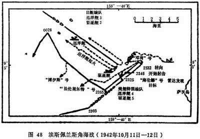 日军在制定10月作战计划时,决定使用军舰对瓜达尔卡纳尔岛连续进行炮击,以摧毁亨德森机场。第1个炮击编队由3艘巡洋舰和2艘驱逐舰组成,从腊包尔出发,10月11日午夜在埃斯佩兰斯角北面闯入斯科特少将的巡洋舰、驱逐舰编队之中。结果,日军大为失利。当时夜暗,能见度很低,就连日军那种猫一般的眼睛也无能为力。而斯科特的旗舰“旧金山”号重巡洋舰没有安装新式SG型对海搜索雷达,如同日军编队那样,也和盲人骑瞎马差不多。