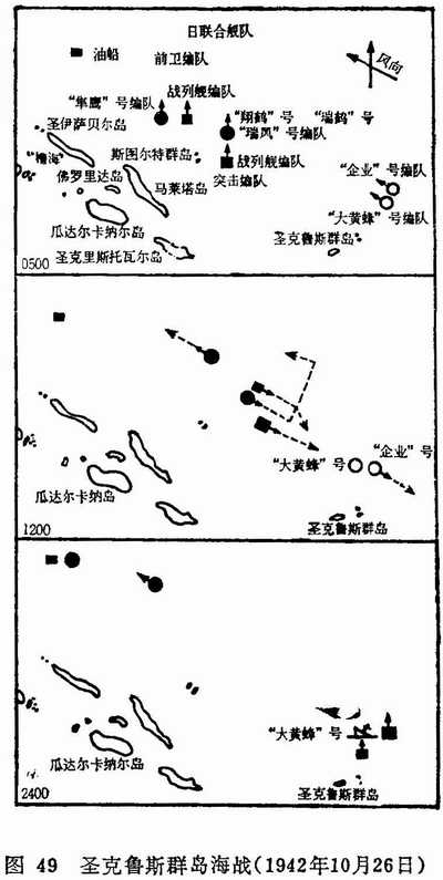 从战术上看,在这场称为“圣克鲁斯海战” [ 译者注:日军称为“南太平洋海战”。 ] 的战斗中,美军遭到了挫败;但从长远观点来看,美军却在战略上获得了胜利。近藤海军中将失掉100架飞机,而金凯德将军只损失74架。这次海战给日军造成的损失是难以用双方丧失飞机的数量所能说明的。因为美国培训飞行员和制造飞机的速度是日本望尘莫及的。