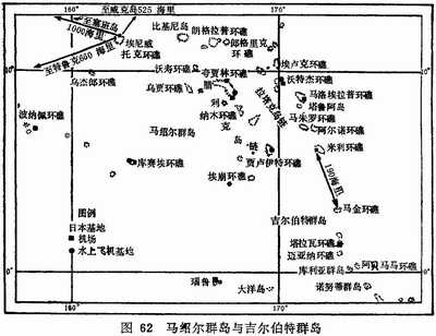 因此,华盛顿和珍珠港的参谋人员得出的结论是,进攻马绍尔群岛应该象对腊包尔发动的进攻那样,采取逐步接近的方式,使美军的岸基航空兵能够进行充分的空中侦察,并与航空母舰上的飞机相辅相成,协同作战。马绍尔群岛同腊包尔的情况一样,也有一条借助于岛屿可以逐步接近的路线。如同俾斯麦群岛一样,马绍尔群岛也位于所在岛链的西北端,这个岛链的东南端是英美共管的萨摩亚群岛,在岛链的中间,有英属的吉尔伯特群岛和埃利斯群岛 [ 译者注:图瓦卢群岛 ] 。盟军在英美共管的萨摩亚群岛和坎顿环礁建有航空基地。坎顿环礁位于萨摩亚群岛以北,吉尔伯特群岛以东,与这两个群岛的距离均约为800海里。