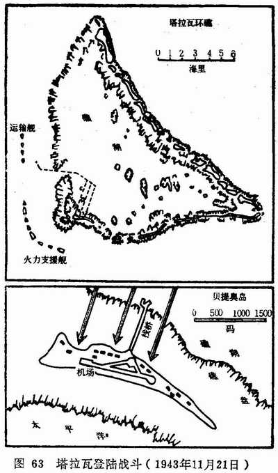 同样重要的是,在吉尔伯特群岛,尤其是在塔拉瓦登陆作战中,美军在战术方面得到一个教训。他们明确认识到,象贝提奥岛这样设防坚固的要地,仅仅进行几个小时的航空和舰炮火力准备是不足以将其摧毁的。每次轰炸或炮击,都要在硝烟消散后查明破坏程度,根据实际效果,再进行较长时间的精确轰炸和经过精密校正的射击。为了穿透日军坚固防御工事的上部,必需使用大口径炮以穿甲弹进行轰击。为了打乱活动目标的行动,原来打算采用迅速转移火力的方式进行射击,后来发现使用这种方式对付固定目标会妨碍自己的射击指挥。这次登陆作战证明,可运送兵员通过礁盘的履带登陆车是很重要的;部队抵岸前,为压制岸上的敌军而以火炮进行抵近射击也是必不可少的。进攻塔拉瓦的经验再次证明,必需建造一种专门用于指挥登陆作战的军舰。在地中海作战时,就曾用过这种指挥舰。它的任务不是进行舰炮火力支援,而是改善岸上和海上的无线电通信联络。即使美军没有在塔拉瓦取得上述的经验教训,也不免要用同样的或者更大的代价,在其他地方取得这些经验教训。