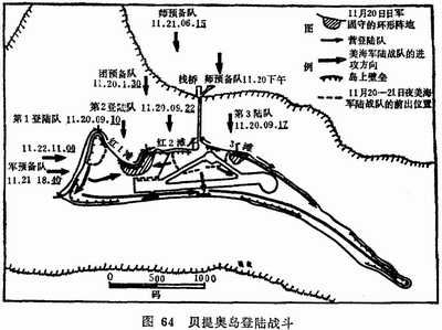 要在这个设防坚固并有重兵把守的小岛实施登陆,当然不会不遭到抵抗,也不会仅仅受到一些轻微抵抗就轻易取胜。美军本应首先占领该岛附近的一个小岛,以便配置火炮,支援上陆战斗。但因舰队必须从支援上陆战斗的任务中迅速解脱出来,而未能这样做。因此,海军陆战队必须完全采取强攻的方式来夺取登陆场。这样一来,制定计划时,对登陆场的选择,必须予以周密的考虑。从飞机拍摄的照片中,看不出哪里是贝提奥岛的防御弱点。然而,进攻者还可根据其他因素来选择登陆场。该岛的南海岸略呈凹形,日军可以利用其抗登陆火炮,从翼侧进行射击。西海岸过于狭窄,突击上陆的第一梯队难以展开。南海岸和西海岸都濒临大海,与濒临环礁湖的北海岸相比,这里的布防较强,而且水中障碍也设置得比较严密。因此,决策人决定,以该岛位于礁湖一侧的1400米长的海滩作成登陆地段。