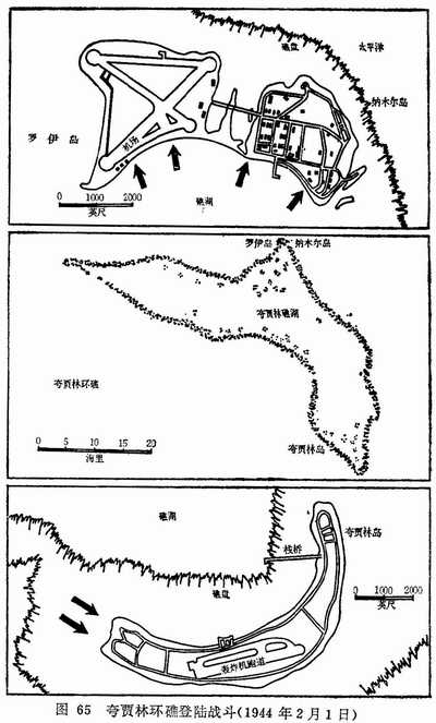 1月30日,理查德·康诺利海军少将率领的北部突击编队和特纳直接指挥的南部突击编队分别驶抵夸贾林环礁。继快速航空母舰舰载机所实施的3天密集航空火力准备之后,又以舰炮和护航航空母舰舰载机进行突击。美国海军认真吸取了塔拉瓦登陆作战的经验教训,在这次作战中获得了良好效果。应首先进攻的目标是罗伊岛和纳木岛。这两个小岛位于夸贾林礁湖的北端,两岛之间有一条堤坝相连。夸贾林岛在这两个小岛的南面,相距44海里。按重量计算,美军在夸贾林岛倾泻的炸弹和炮弹,比用在贝提奥岛的炸弹和炮弹多3倍。飞机对选择的目标进行了精确的轰炸。炮火支援舰群根据实际需要修正射击方向和距离,并且改用了穿甲弹。