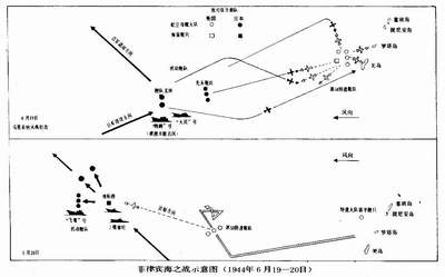 凌晨5点半,第58特混舰队从北纬十四度三十五分、东经一百四十三度四十分处向一百八十五度方位进行了三百二十五海里的搜索,但未碰到敌舰。10点45分,西面的敌机开始对第58特混舰队进行长达数小时的空袭。有的敌机降落在关岛和罗塔岛机场上,但第58特混舰队的飞机多次轰击了这些机场,以阻止日机使用。据报告,美军飞机和高射炮已击毁敌机三百余架。美机损失情况尚未报来,已知“南达科他”号被一枚炸弹击中,但不影响作战。据信,敌军还可依靠关岛和罗达岛的机场补充弹药和油料,继续进行袭击。若真如此,日军飞机的损失将还会增加。