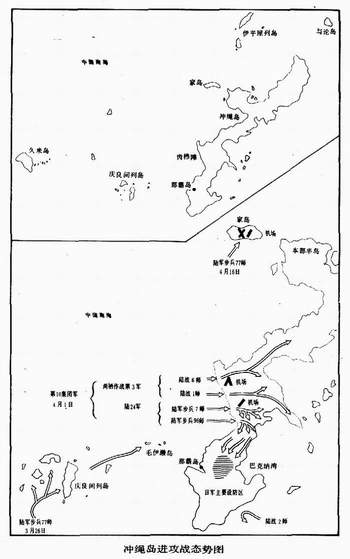 在拟订冲绳岛作战计划时,尼米兹最担心的是,美军在岛上建立机场之前敌人空中力量对入侵部队究竟有多大危害。在东北方向,九州有五十五个机场;在西南方向,台湾有六十五个。在它们之间,沿着包括冲绳岛在内的硫球群岛还有许多跑道。由于日本人,除了菲律宾中部外已不在其他任何地方作战,而且菲律宾中部日军同本土的联系和一切供应都已被切断,因此可能动用在本土的三千或四千架飞机,运用致命的神风式自杀战术以抗击美军的进攻部队。
