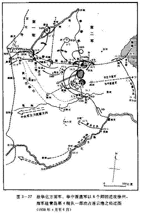 寺内的华北方面军于4月10日确定,以5个师团的兵力进攻徐州。即先以一部用连续作战的方法,吸引和牵制住徐州以北、津浦路以东的国民党军;主力进至徐州以西、以东、以南地区,进行迂回,与华中派遣军协同,遮断国民党军的退路而围歼之,并占领徐州与附近地区。其进攻部队之任务与部署为:
