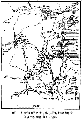 (三)第101师团,由永修渡过修水,一路沿铁道攻向南昌;另一路经铁道以西的马口、城山、万埠,攻向南昌西南的璜溪、生米街渡过赣江,从西南方向迂回攻占南昌。