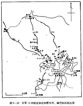 松山良政的第6联队,配属两个工兵小队,辎重兵1小队,于11月20日从宜山以北经祥贝、天河、怀群、河宾、八面、上朝、驯乐、坤地、新场、地牙、十里坡、九阡、周覃、三洞、水龙、三合(三都县)、交梨、八寨(丹寨县),以后即向西经牛场攻占都匀。