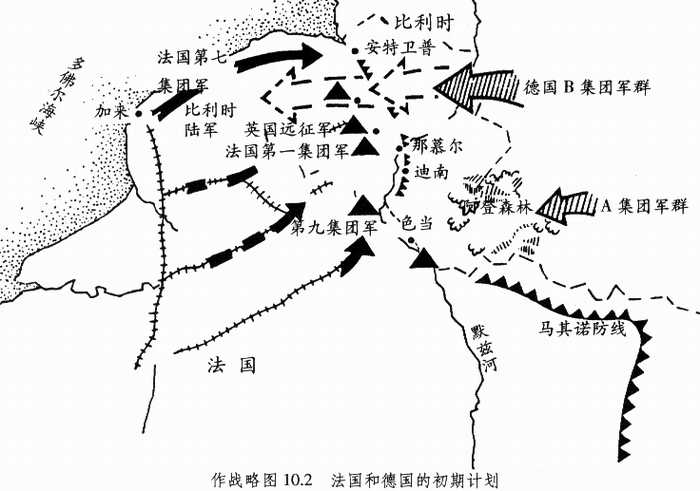 由法军参谋长莫里斯·甘末林最后确定的法国作战计划,把法国第一集团军装备精良的10个师和英国远征军的9个师部署在那慕尔北部前线20英里的正面上,比利时军队的14个师则负责掩护其余到安特卫普40多英里的正面。其他比利时师从前沿阵地后撤,准备用于增强前沿部队。此外,法国第七集团军(编有7个师)打算沿海岸向安特卫普推进,那里是与荷兰接合部,并有位于德军进军部队翼侧的阵地。由于甘末林将军1914年曾在霞飞元帅的司令部任职,第七集团军可能具有霞飞缔造的第六集团军的某些相同的作用,1914年该集团军被部署在德军进攻队形的翼侧。该计划希望法国部队快速运动,以便在东部尽可能远的地方与德军交战,因此要求法国、英国和比利时的军队控制安特卫普与那慕尔之间的戴尔河一线。
