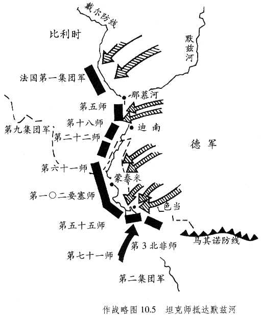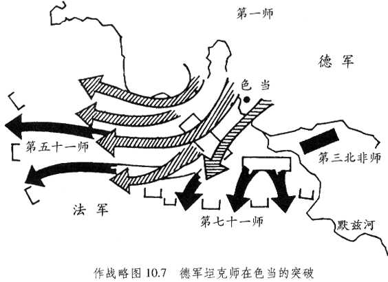 但是在阿登地区,战事的发展一如德军计划。由于对盟军航空兵空袭进行了有效的防御,德军在通过阿登山区的进军中,只遇到了被派来迟滞德军的法国5个骑兵师的有限抵抗。法军希望且不幸的是他们也深信,德军在这一地区的进攻主要使用步兵,而且兵力有限。由于法军骑兵师基本上是侦察部队,所以只编有炮兵、车载步兵、装有机枪的小坦克和少量轻型坦克及乘马骑兵。这种脆弱的部队对德军的迟滞只能是短暂的,其主要原因是德军庞大的坦克师集群几乎都自动迂回或包围法军占领的任何阵地。坦克部队展示了他们战术进攻的性质。例如,当坦克遭到法军105毫米榴弹炮的拦阻时,它们就向翼侧迂回,攻击这些炮兵阵地的后方。即使在不便行动的国家,坦克部队也证明它们适于采用德军步兵所擅长的渗透战术。