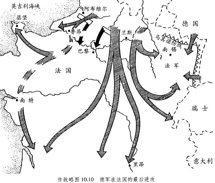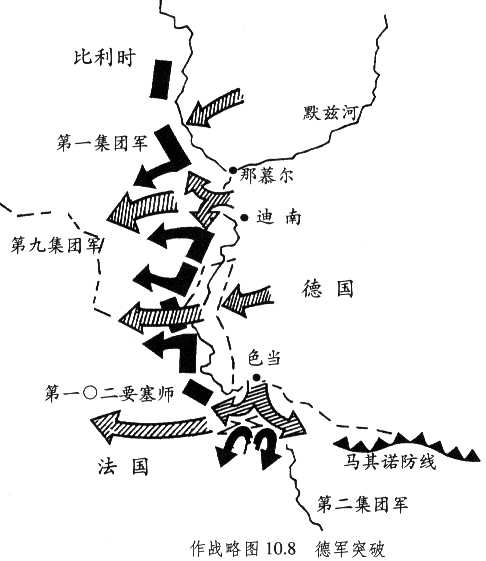 事实上,德军参谋部对突然集中兵力和解决突破问题所给予的关注如此之大,以致于除了追求胜利的行动之外,什么也不考虑。从某种意义上说,在第一次世界大战中,突破层层设防的阵地是如此困难,成功的希望是如此渺茫,以致变成了谁对这种防御进攻,谁就等于自取灭亡。执行突破任务的部队突破后可以转而向南,打击沿马其诺防线部署的法国军队;也可以向西,直指英吉利海峡,甚至可以直接进攻巴黎。但是在缺乏明确方向的情况下,坦克师的指挥官们都希望达成曼斯坦因的目标,向海岸推进。