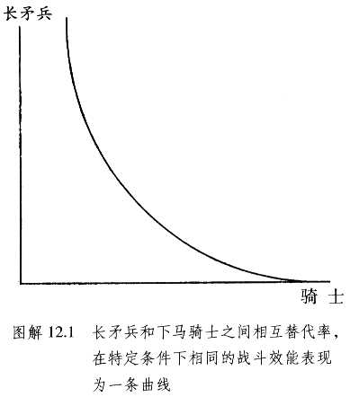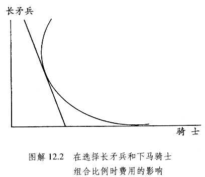 当英国国王在决定费用高的骑士和便宜的长矛手的比例时,要对花费和作战的因素共同加以考虑。骑士和长矛手在抗击进攻时可以互相替代,但长矛手却完不成由骑士承担的驱逐十字弓手的任务。另外,英国国王还会考虑到一些马下骑士与长矛手混合编组可以加强防御的力量,他还需要一些骑士担负侦察和应付可能妨碍军队前进的乡村游击战的任务。这样,假如他原先只想使用一些长矛手的话,现在他将用两名骑士代替3名长矛手。但他想用更多的骑士代替长矛手时,对其他因素的考虑将比仅仅抗击敌人正面冲击的考虑更为重要,如果这种取代过程继续下去,国王将逐渐达到甚至超过4名或更多的长矛手代替一名骑士的比例。最后,他得到一个不能再少的比例,比方说,必须有10%的骑士应付敌方的十字弓手。由于在长矛手数目增加时费用发生变化,这是一个递减率的例子,图解12.1上关于假设的国王在长矛手和骑士间相互取代的例子是一条曲线而不是直线。