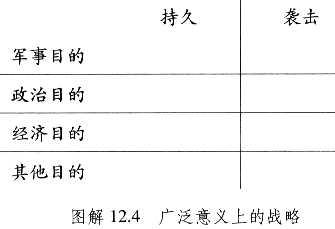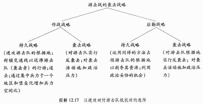 图解12.17对上述内容进行了总结。作战战略和后勤战略的成份通常是相互结合的,而持久战略和袭击战略之间的区别构成军事战略的基本区别。战役中的政治成份经常制约着军事战略的运用,当然游击队必须有一个可接近的根据地。