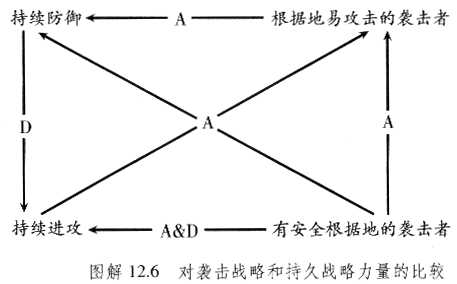 图解12.19对西方两千五百年历史中影响战略的因素,及据此采取的方法作了总结。我们简单地认为可以将战略的问题及选择归结为这一期间战争史中所提示的三种主要的不变因素。即:在交战双方都采用持久战略时撤退具有优势地位,及战术防御通常具有的优势使防御成为一种较强的作战形式;较低的兵力空间比对撤退的一方有利;而较高的兵力空间比则要求实行战术防御。上述因素中的两个对运用袭击战略比较有利,因为在敌人的兵力空间比较低的情况下,他既可以利用后退的优势,又可以利用袭击目标的不确定性获得集中兵力攻击敌人弱点的大量机会。