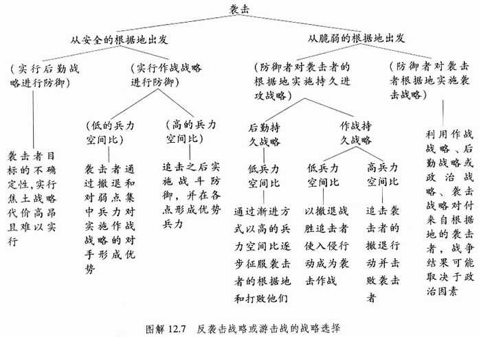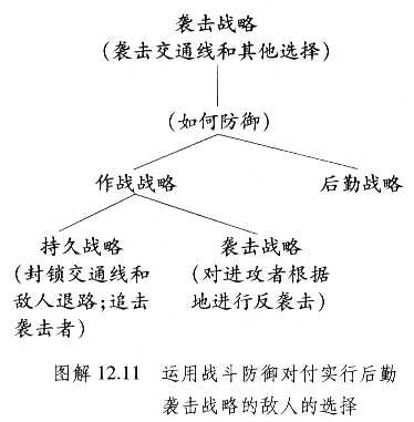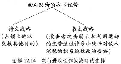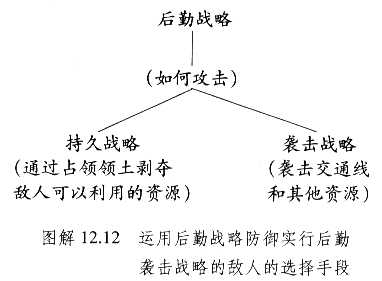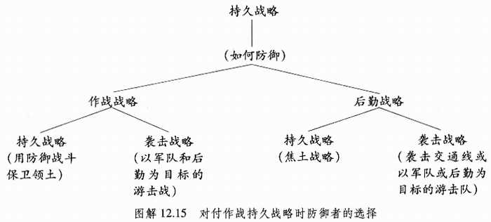 图解12.15总结了上述选择。袭击战略的游击战可用于防御后勤战略,也可以防御作战战略。但防御者通常会发现运用持续作战战略取得胜利的代价最小,可以此避免持久的代价高昂的游击战或较小牺牲的持续后勤战略。例如,苏格兰人只是在认为没有在战斗中战胜英国人的可能性之后才避免与其作战并实行焦土政策的。