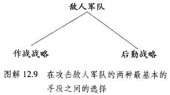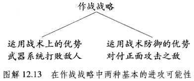 持久战略的相对劣势和在对付实行持久战略对手的防御时袭击战略力量的两种因素,可以用来解释为什么在如此长的战争史上袭击广受欢迎。然而,袭击虽重要却只能给敌人造成小的伤害,而要征服袭击者的土地,却需要依赖于持久战略。在对上述两种战略进行选择时,指挥官通常都将打击的目标对准敌人的弱点。事实上,如果给图解12.19加标题的话,可以用“寻找弱点”加以总结。军队在进攻时,总是沿着抵抗最小的路线,运用优势的武器系统进攻敌人的战术弱点,例如敌人的侧翼或后方,或以众击寡。即使是迫使敌人保护自己的军队、救援被围部队或恢复其交通线,进攻军队都可以成功地迫使防御者使用战术上较弱的形式——进攻。