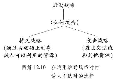 图解12.14是指挥官在奉行作战战略时需进行的选择。实行持久战略的目的通常是消灭敌人军队,这是一种更直接的取得战争胜利的方法,它是通过军事胜利的心理影响,在短时间里赢得战争或占领大量领土。但在典型的战例中明智的指挥官实行持久战略的惟一方法是占领敌人领土。像1870-1871年的普法战争初期普鲁士取得的那种歼灭战的胜利,在没有先进的武器系统或军事学说的情况下是很难达成的。例如,亚历山大对大流士的胜利、汉尼拔对罗马人的胜利、安息人对罗马人的胜利、拿破仑在他的事业的早期对他的对手们的胜利、德国在1940年对其对手们的胜利等。