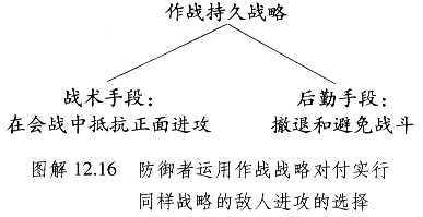 要实行持续作战战略,防御者必须有足够强大的力量能在他自己选择的阵地上与入侵者正面作战。这样,如果他担心会战的后果或不能在最有利的阵地上与敌人作战,他就可以以其战线的正面面向敌人或进行撤退。他在采用作战持久战略时,可以像图解12.16所总结的那样使用防御者的较强的战术和战略上的选择。如果没有强有力的政治支持,防御者将会仿效大流士三世那样冒丧失一切的风险进行战斗而不是撤退。如果有强大的政治力量,防御者可能模仿罗马人在费边领导下与汉尼拔战斗,或像俄国沙皇在1812年抵抗拿破仑的做法。