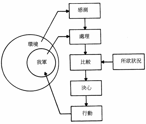 退休前仍担任海军电子系统指挥部(Naval Electronics Systems Command)首席科学家之劳森博士(Dr. J.S. Lawson)使用指挥管制一词代表指挥官运用职权,指挥部队达成任务之程序。大约在1977年,劳森博士与海军研究院慕斯教授(Professor Paul Moose)共同设计如图8-1所示之决策周期。 [ 原注:无独有偶地,欧洲盟军统帅部技术中心(SHAPE Technical Center)柯以尔博士(Dr.Geoffrey Coyle)也提出类似论点。苏联有关控制论的科学研究中亦有证据显示,早在1960年代苏联即已提出类似之指挥管制模式。见Abchuk等以及Ivanov等所着之作品,两者分别为1964年与1971年版之修订版。James Taylor(Pp.36-41)对苏联指挥管制之研究提供有助益之论点。 ] 内容包括决心(decision,指挥之一环)、感测(sensing,侦搜之一环)及行动(acting,透过通信进行管制之部份作为),以及所有之战术程序。劳森、慕斯及其同僚将「感测」与「行动」纳入指挥管制程序中并置于回馈环路中,扩大指挥管制的内涵。渠等并研究指挥管制对火力投射与侦搜产生之效能,例如火力发射率或监侦情报品质(对战术相当重要)。有了指挥管制流程图后,吾人可检视整个战术环境与指挥管制之效能,观察火力投射、侦搜,以及指挥管制的每个步骤。战术分析人员可用其中两项为依据,仔细检视第三项。例如,分析人员假定双方之战术侦搜与武力投射计画后,即可专注于旗舰战情中心如何取得情报,以及这些情报如何在内部,流通(属指挥程序)。另外渠亦可研究命含在通信网络上之流程,例如将敌潜舰定位后实施攻击,并将重点置于运动路线以及完成攻击所需时间(管制程序)。