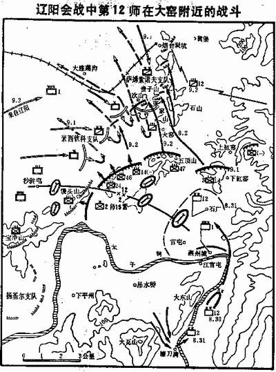 9月1日第12师以右翼(以第14、47步兵团为基干)向五顶山方向进攻,以左翼( 以第24、46步兵团为基干)向馒头山北侧至沙浒屯方向进攻。当时,俄军侦察到日军 到达北岸,除投入直接担任防守任务的第17军团的大部以外,又从俄军主力方面调来 强有力的部队投入战斗,企图歼灭第12师。第12师师长查明上述敌情后,企图迅速夺 取大窑南侧的要点,粉碎俄军的进攻。便命令第47团占领并确保五顶山,与此相结合配置了全师的兵力(详见要图),将炮兵推进到五顶山南侧,同时派骑兵团监视黄堡 方向警戒右翼,完成了迎击的态势。