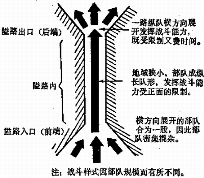 (四) 隘路战斗因隘路入囗、隘路内和隘路出口的情况不同而异。