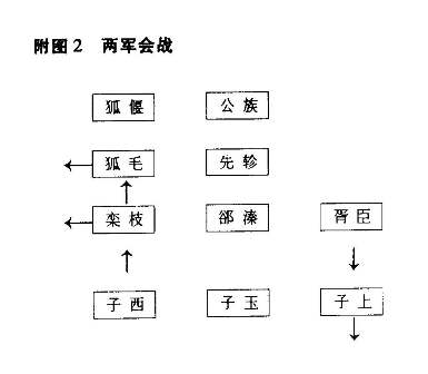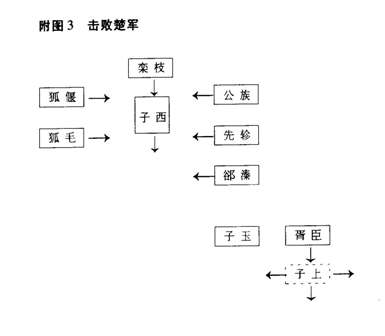 《左传》的惟一缺点是对晋军战斗序列的正确位置不曾说明。照理说,那样多的人不可能都摆在一条横线上。所以,晋军各单位可能采取梯次配置,也许栾枝在第一线,二狐分别占第二及第三线,因此,上军必须先移动,然后栾枝才能向后伪遁。这样在正面上就会呈现缺口,不怕楚军不钻进来(附图2及附图3)。