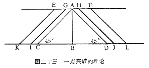 突破的主要困难在于要不间断地前进。突破时通过敌翼侧威胁地带比遭敌正面抗击困难要小些。有趣的是,在上次世界大战中,突破所形成的突破口的侧角一般都是四十五度,没有大于四十五度的。这说明什么问题呢?这说明,突破必须以对突破深度和敌防御性质等因素的严密计算为基础。这些计算(记住按四十五度角突入侧翼)使我们能够判断我们是否有足够的兵力承担负定正面的进攻。如图二十三,假如敌防御纵深A-B为五英里,那么我们就知道要进攻的正面C-D为十英里。但是,只派少数兵力自A突破是不够的,因为突破的缺口必须有适当的宽度,足以使担负扩张战果任务的部队能迅速向前机动,也就是说能够不遭敌机枪火力的杀伤。这样的缺口至少得五英里宽,如E-F。这也会使一个两英里宽的前沿G-H完全免遭火力攻击,同时也会有一个相当大的区域GIJH能够配备部队。因此,我们必须给原来十英里宽的进攻正面每侧加两英里半,从CD扩大到KL,这样KL就有十五英里。
