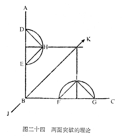 假如在敌方翼侧某处可以找到一个突破部——如图二十四中的ABC。如果从DE和FG两面发起正面进攻,其目的并不是要从这两个正面突破敌防御,而是要使这个地区的敌人不得安宁而只好从这个地区撤退,敌人一撤退,我们即沿着JK线实施突破。