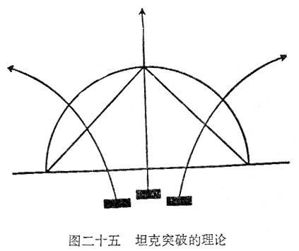……坦克分三路机动,见图二十五。中路照直前进。……翼侧的两路冲进敌的凹部,再向外迂回,涌向各侧的敌后方。这样会导致什么结果呢?随着突破的深入,最初的进攻正面就会扩大,而不会缩小。