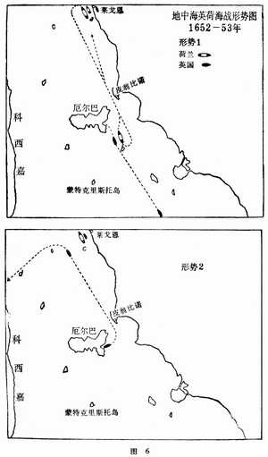 冲突开始时,荷兰在地中海的兵力总数处于优势。英国的总兵力处于劣势而又分散。一部分随其指挥官驻泊于里窝那港;另一分舰队则远在地中海东部担任护航。我不想一一详细指出数支英国分遣队的运动。我们只要说荷兰指挥官恰好置身于它们之间,就足以说明问题;他首先对里窝那港(见图6,形势1,a)实行监视,或通常称为封锁;然后在内线进行明智的运动借以隐蔽其位置和意图,同时却又总是保持其中央位置,即位于两支英国分遣队之间。结果,按惯例得到若干艘较强商船增援的英国地中海东部分遣队,被迫于厄尔巴岛之外接受战斗(见图6,形势1,b)。由于处于明显劣势,该分遣队遭到痛击而避入隆贡港,损失军舰一艘;这艘军舰后来于里窝那的中立海域又被驻泊在该处的英舰夺回,并在隆贡港重新归队。这次战斗发生于1652年8月28日。