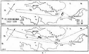 当时,即在第一次战斗之后,有关的两名英国军官和共和政体派驻在里窝那的外交代表,为了坚守和维护国家荣誉都曾写信迫切要求本国政府派遣援军;政府曾经同意照办。北海和海峡的早期战争事件,总的看来对英国有利,当时英国兵力雄厚;但在1652年8月于普利茅斯港外的一次遭遇战时,在条件相同情况下,大体上双方兵力相等,结果对双方舰队来说不分胜负(图7,形势1,a)。事实上,荷兰舰队司令勒伊特在这次战斗中未损失一艘军舰和商船,成功地率领一支护航队为其打开了一条通路;而英国人则退入港内再未出动,胜利可以说是属于荷兰。勒伊特目睹其所护送的船队全部进入大西洋,而后率领一些返航的商船驶回海峡,同舰队司令德威思所统率的主力舰队会合(见图7,形势1,b)。会合之后,随之于1652年9月28日发生了肯特之战(图7,形势1,c)。荷兰人在舰船数量和质量上均处于劣势;然而,双方力量为六十八对六十四,接近相等,这就不由使人想起,荷兰人在地中海的巨大优势乃是处其在决定性中央战场于劣势这一高昂代价而换得的。