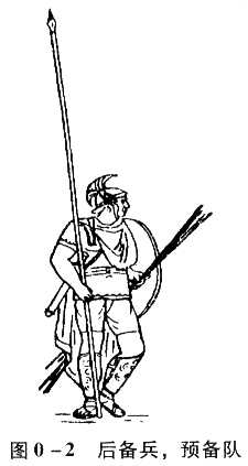 三排中的每一排都有10个中队,因此军团中构成横排的部队有1200名剑矛兵,1200名主力兵和600名后备兵。此外,必须加上1200名或者更多一些的轻装兵(韦利特),由此使军团的步兵达到4200名,其中3000名是重装兵。每个军团还有300名骑兵……[他们布列于侧翼]