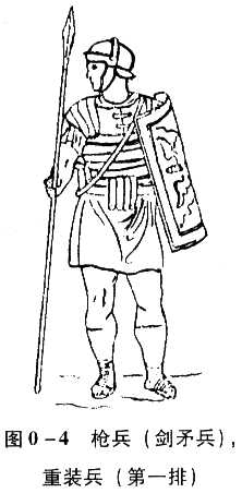 只有财产达到规定的数额的自由民才允准服兵役,凡财产额不足12500阿司(古罗马铜币,价值从1分到17分不等)的人都不能服役 [ 注:根据戴奥尼西的说法,塞尔维乌斯·图利乌斯把罗马人按财产标准分为五个等级:第一等级为10万阿司;第二等级为7.5万阿司;第三、四、五等级依次为5万、2.5万、1.25万阿司。在此以下者称“无产者”,不列级。所谓财产额不足1.25万阿司者即无产者。 ] ……因此,军团是由一些社会最上层的分子组成的。原来,到哪个部分去服役以及在军团中的地位都取决于阶级等级。但是,后来就变为依据服役时间长短来定夺了。因此,最年轻的士兵,17到25岁的当韦利特,即轻装兵;25到30岁的,当剑矛兵(枪兵),即第一排的重装兵;30到40岁的,当主力兵,即第二排的重装兵;40到45岁的,当后备兵,即第三排的预备队。