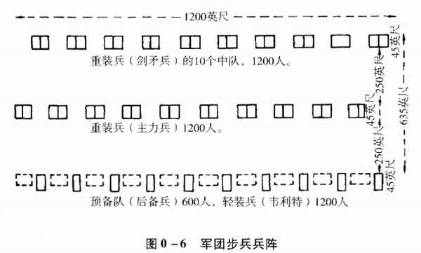 轻装兵充当散兵。一名军团军士占据的空间大致为5平方英尺。剑矛兵和主力兵都以中队或班为单位,构成横排队形。每个单位60-120人不等。正面12人,纵深10人,每两个中队之间的间隔相等于一个中队的正面。主力兵中队的位置在剑矛兵后面,后备兵中队仅60人,他们也站在剑矛兵后面。彼此间的间隔都约250英尺。
