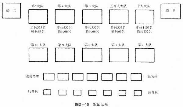 第七大队由步兵555名和骑兵66名组成。第八大队由步兵555名和骑兵66名组成,它的建制中应有无畏勇士,因为在第二排里第八大队位居中央。第九大队由步兵555名和骑兵62名组成。第十大队也由步兵555名和骑兵62名组成,通常该大队也由优秀战士编成,因为在第二排里它配置在左翼。