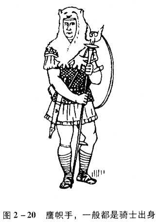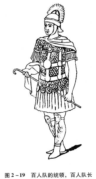 全体前排兵和旗手,甚至步兵穿一种较轻便的铠甲(loricae),戴的头盔上盖着熊毛皮,以吓唬敌人。百人队长所穿戴的铠甲、头盔,所持的盾都是铁制的,上面还镶有银制的冠状物,那是为了便于自己人辨认出他们的身份。