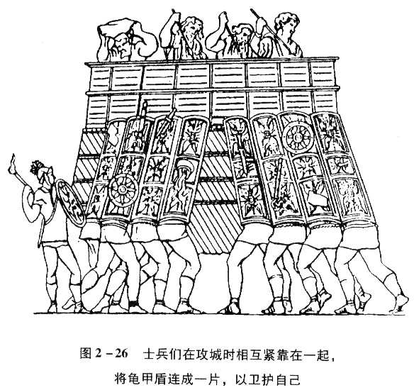 军团还编有配备成套工具的工匠,他们负责制作为围困敌城所需的龟甲盾(testudines),为撞开城门所需的掩体(musculi)、攻城槌和遮盖攻城槌的顶棚,以及活动碉楼。