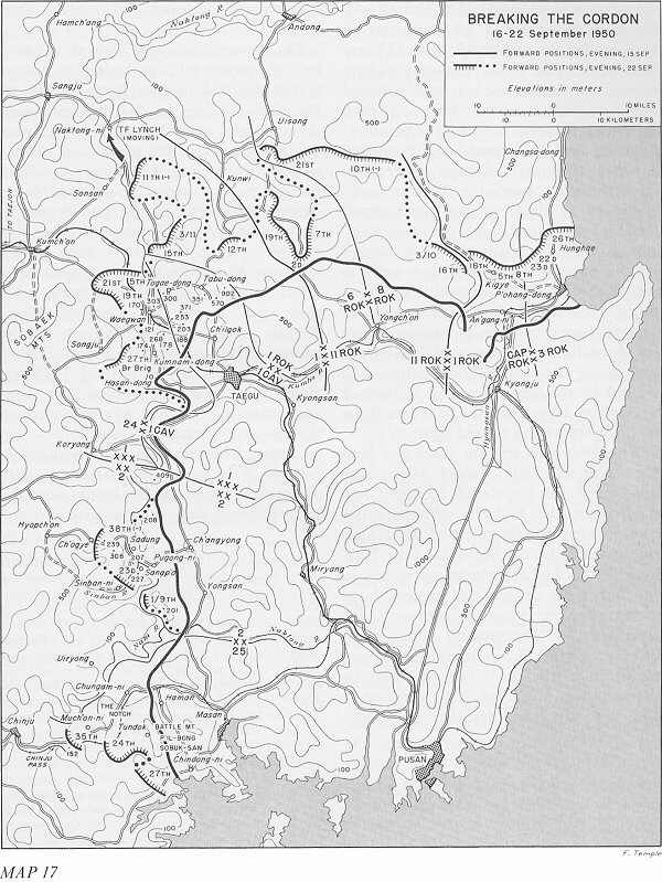 原定9时发起的总攻并未在防御圈的所有地方都按时付诸实施。其原因很简单:在许多地方北朝鲜部队在进攻,而联合国部队在防御。观测员在大部分地段上看到的是,9月16日上午与9月15日、14日甚至13日上午的情形无甚两样,还是老样子的防御圈情况——突击与反突击,冲击与反冲击。诸高地的争夺战只不过是又继续一天。进攻开始后的头一天里只是少数几个点上取得了重大战果。南朝鲜第1师第15团突破敌军防线,推进到大邱以北北朝鲜军支撑点的右侧。在此向南,美军经过激战向瞰制洛东江的诸高地方向突进了5哩。
